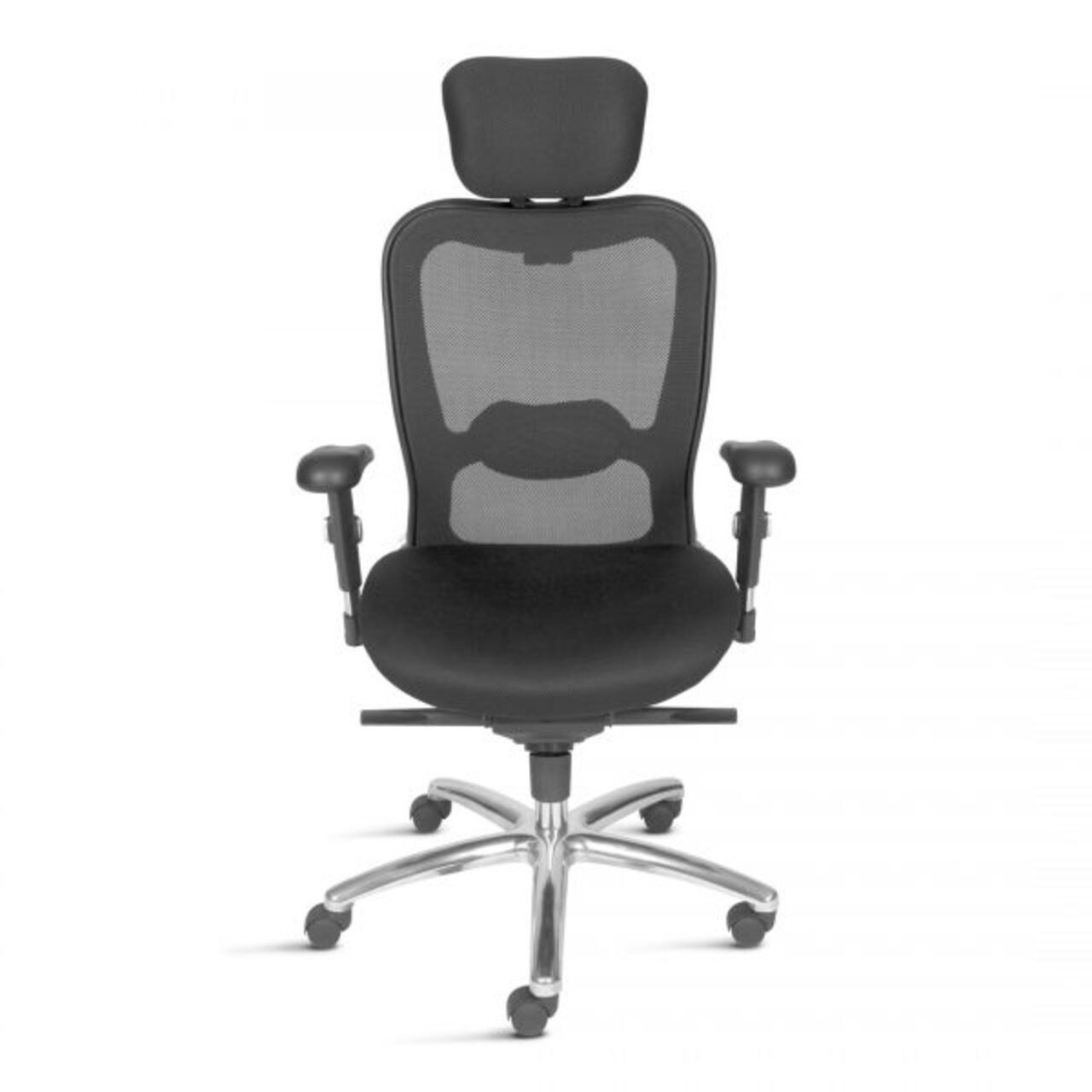 Modelo com encosto em tela, regulagens ergonômicas, base em alumínio,